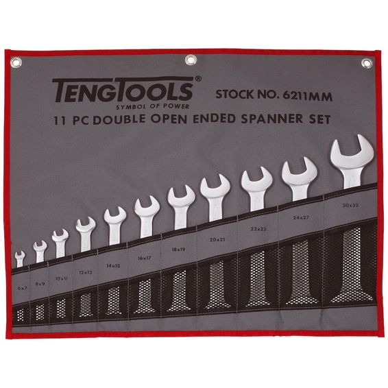 11 piece double open ended spanner set with the different dimensions at each end. DIN 3110 ISO3318. Polished heads with satin finish. Supplied in a handy tool roll.
