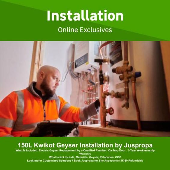 What Is Included. Electric Geyser Replacement by a Qualified Plumber. Via Trap Door . 1-Year Workmanship Warranty What Is Not Include, Materials, Geyser, Relocation, COC Looking for Customized Solutions? Book Juspropa for Site Assessment R350 Refundable