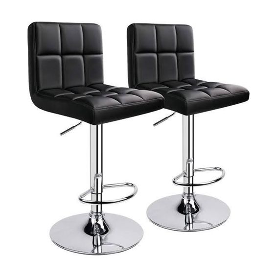 Elevate your home bar or kitchen island with this stunning set of two Black Square Tufted Bar Stools. Designed for both style and comfort, these stools feature a sleek black faux leather seat with a distinctive square tufting pattern that exudes sophistication. The polished chrome base provides a striking, contemporary contrast, making them a focal point in any room. Key Features: Adjustable Height: A smooth gas lift mechanism allows you to effortlessly adjust the stool height to fit any counter or bar. 360-Degree Swivel: The full-range swivel function offers maximum mobility, perfect for conversation and easy access. Sturdy & Stylish: The durable chrome base and built-in footrest ensure stability and comfort, while the modern design complements a wide range of decor. This is more than just seating—it's an instant upgrade to your entertaining space.