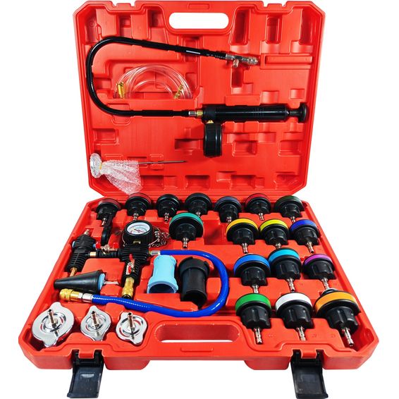 This 28-piece radiator pressure tester kit is designed for testing leaks in cooling systems and facilitating quick coolant changes. It includes a pressure testing pump, adapters, test caps, a vacuum refill tool, gauges, and a carrying case, making it compatible with most vehicles. The high-quality aluminum alloy and rubber materials ensure durability, while its universal design suits various car brands.