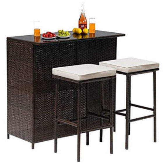 3pc Wicker Outdoor Patio Bar Set with Glass Top & Beige Cushions