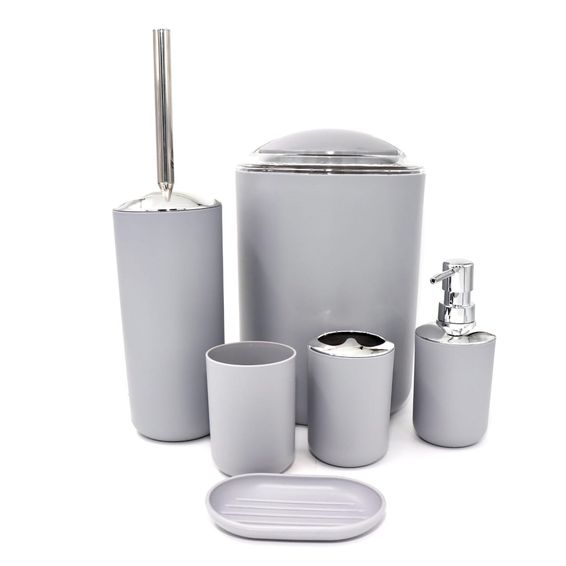 Six-piece plastic bathroom accessories set in a grey colour with silver-coloured accents.