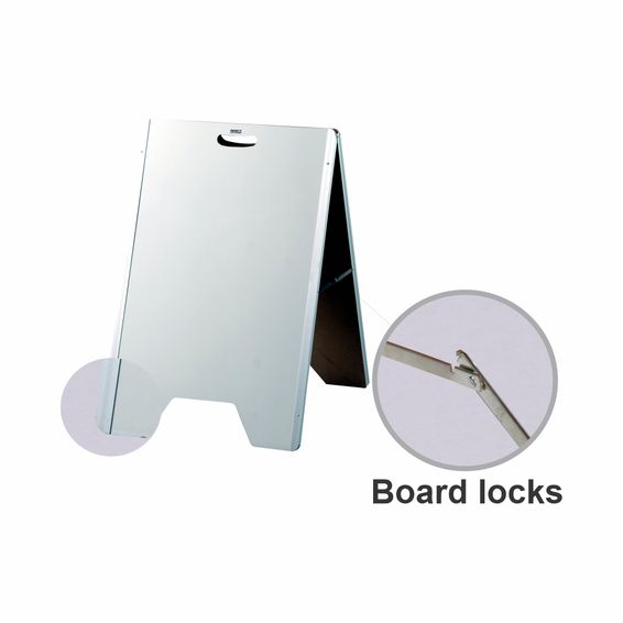 Board Locks in stable positionLightweightStanding height of 850mm when openAluminium framework (25mm)Weather resistant (approximately 2 years)Supplied with Whiteboard Marker (Black)Non-Magnetic surface