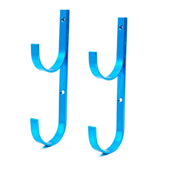 Metal pole hangers are made of blue anodized aluminum and come as a set of two brackets.