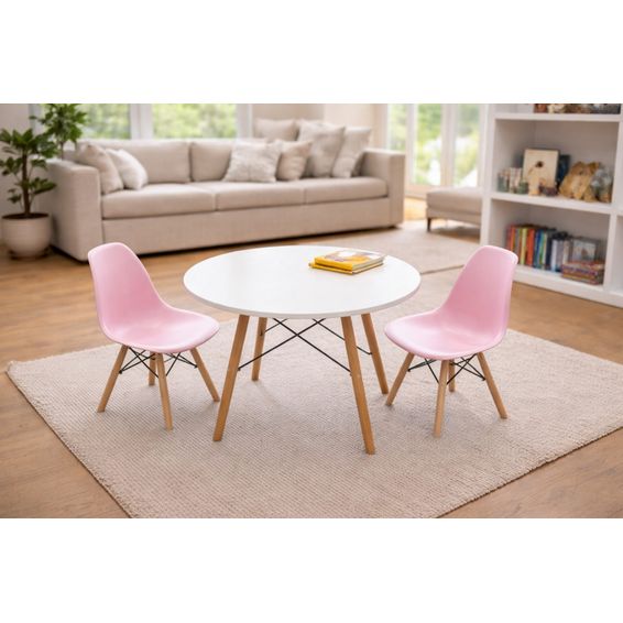 Modern Kids Table & Chair Set – Light Pink Create the perfect space for your little one to play, learn, and create with this stylish kids table and chair set. Designed with a modern Scandinavian look, this set blends beautifully into any living room, playroom, or nursery while giving children their own comfortable space for activities. The set features a round white table paired with two light pink molded chairs that are both durable and easy to clean. The smooth curved seats provide comfortable support for children, while the solid wood legs with reinforced cross supports ensure stability and long-lasting use. Perfect for arts and crafts, reading, snacks, homework, or playtime, this charming set adds both functionality and style to your home. Features: Modern round kids table with 2 chairs, Soft light pink chairs with smooth, child-friendly finish, Sturdy solid wood legs with reinforced steel supports, Durable, easy-to-clean surfaces, Lightweight yet stable design, Perfect for playrooms, bedrooms, classrooms, or living areas. Dimensions: Table Height: 50 cm, Diameter: 60 cm, Chairs Overall height: 55 cm, Seat height: 30 cm, Seat width: 32 cm, Seat depth: 28 cm, Includes ✔ 1 Round Table, ✔ 2 Light Pink Chairs. This adorable table and chair set is ideal for toddlers and young children, giving them their own cozy space to explore creativity and independence. The chairs are also available in blue or white .