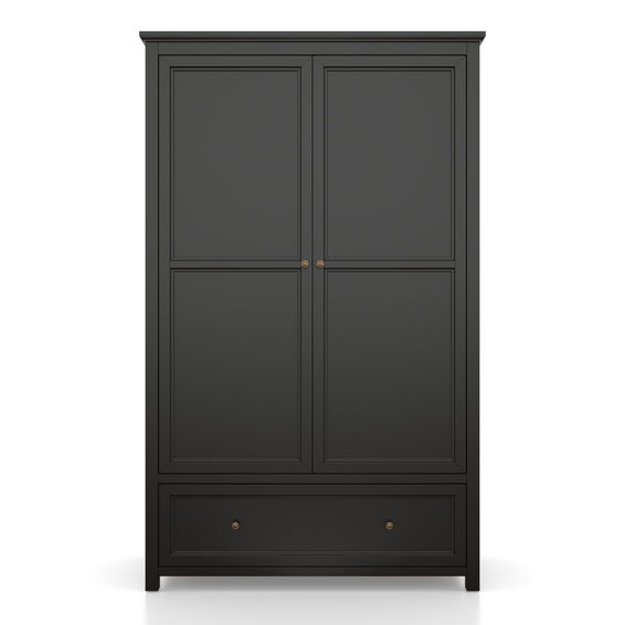 Designed in a sophisticated cottage home style, the Ives Wardrobe Black combines traditional detailing with modern versatility. Behind its two elegant panelled doors lies generous hanging closet space, perfect for keeping your clothing organized and wrinkle-free. Below, a spacious bottom drawer provides additional bedroom storage, ideal for folded garments, linens, or accessories.