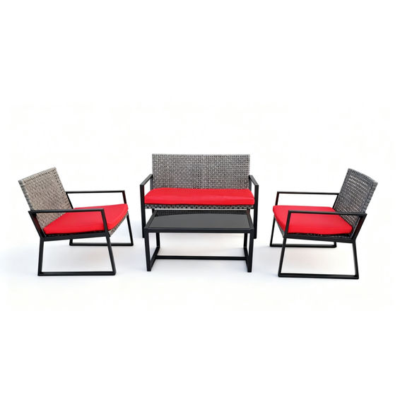 Upgrade your outdoor space with the 4-Piece Patio Conversation Set, designed for comfort, durability, and timeless style. This elegant black metal patio set includes plush red olefin cushions that are both UV and stain-resistant, ensuring long-lasting color and performance. Perfect for entertaining family and friends, the set includes two armchairs, one loveseat, and a tempered glass-top coffee table — combining modern design with everyday functionality.