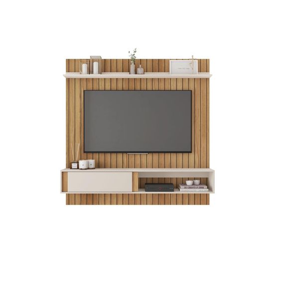 OAK/ WHITE The Boreal TV Panel by Caemmun is a modern and functional piece for your living room. Made entirely of MDF, it ensures durability and strength. Its grooved low-relief design adds a touch of sophistication to the space. Ideal for TVs up to 65 inches, it also features a top shelf for displaying decorative items, as well as a niche with a sliding door to organize your electronics—creating a modern and stylish environment.