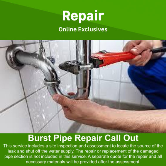 This service includes a site inspection and assessment to locate the source of the leak and shut off the water supply. The repair or replacement of the damaged pipe section is not included in this service. A separate quote for the repair and all necessary materials will be provided after the assessment.