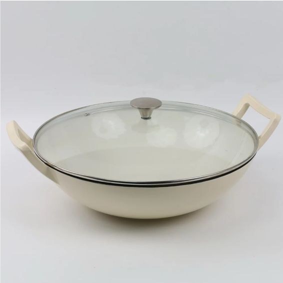A white enameled cast iron wok with a glass lid. Key features include: • Material: It's made of durable enameled cast iron, known for excellent heat retention and even distribution. The enamel coating provides a non-stick surface and prevents rusting, eliminating the need for seasoning like traditional cast iron. • Design: The wok has a deep, rounded body with sloping sides, ideal for stir-frying, sautéing, deep-frying, and other cooking methods. It features two loop-style handles for easy and secure handling. • Lid: A transparent, heat-resistant glass lid with a knob is included, allowing for easy monitoring of food during cooking and locking in moisture for steaming or braising. Versatility: This type of wok is compatible with various heat sources, including gas, electric, induction, ceramic stovetops, and is often oven-safe up to certain temperatures (e.g., 250°C for the pot, 220°C for the lid in one example