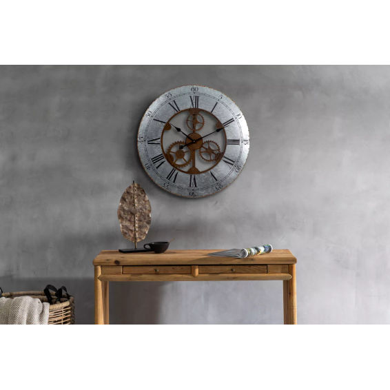Add a vintage flavour to your living space. The Open Dial Gear Wall Clock boasts an intricate clock face design, roman and standard dials, and a metal finish.