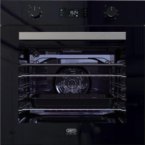 Upgrade your kitchen with the sleek and modern Defy Built-In Oven in Black Glass. This slimline oven is designed to fit seamlessly into your cabinetry, providing a stylish and functional cooking solution. With a generous 70-liter net volume and a range of convenient features, this oven is perfect for all your baking, grilling, and roasting needs.
