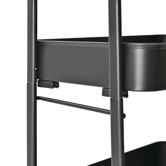 Introducing the DEL CASUAL 3 Basket Trolley with Wheels in sleek black. This versatile trolley is perfect for organizing and transporting items around your home or office with ease.