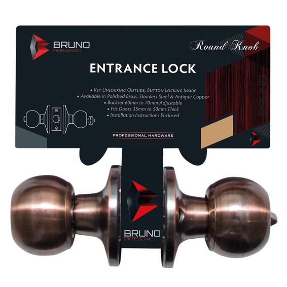 Upgrade the look of your entrance with this stylish round shape antique copper look Bruno lockset. This lockset not only adds a touch of elegance to your door but also provides security and functionality.