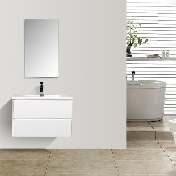A modern vanity cabinet in a white gloss finish 800mm wide.