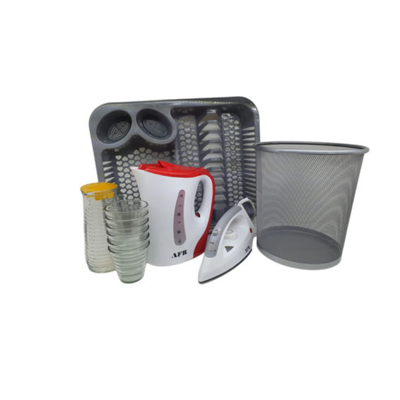 Kickstart Your Culinary Journey with Our Kitchen Start-Up Combo! Included : 1 X Kettle , 1 X Grey and White Iron , 1 X Grey Dish Rack , 1 X Grey Steel Mesh Bin , 1 X Glass Jug & 6 Drinking Glasses. Whether you’re setting up your first kitchen or looking to upgrade your essentials, our Kitchen Start-Up Combo provides everything you need to get cooking right away. This all-in-one set combines quality, functionality, and style to make your kitchen both efficient and enjoyable.