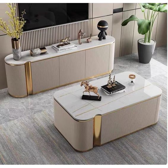 LBM FURN- White & Gold Set Of TV Stand & Coffee Table