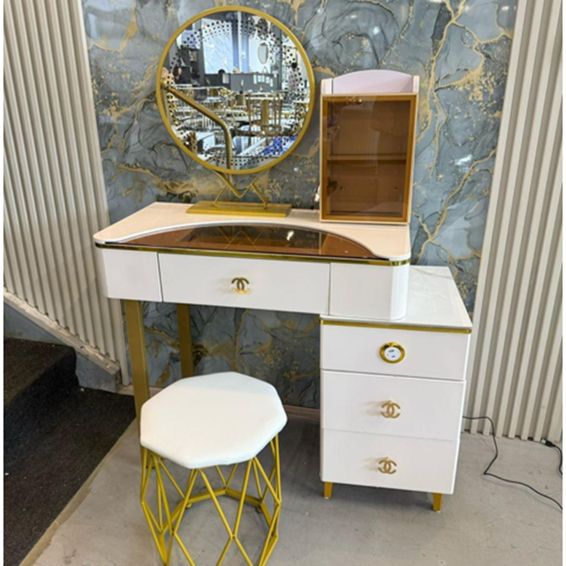 The Elegant White & Gold Dressing Table Set is a luxurious, stylish vanity ensemble featuring a pristine white desk with sleek gold‑trimmed edges and gold‑finished legs that exude modern sophistication. The set includes a curved glass top surface for easy makeup arrangement and two white drawers with elegant gold “CC” knobs for organized storage. A round gold‑framed mirror sits atop the desk, providing a glamorous reflection space, while an additional gold‑lined open cabinet offers extra storage for beauty essentials. Paired with a matching white cushioned stool on a geometric gold metal base, the set creates a chic, high‑end dressing station perfect for everyday grooming or glamorous styling in bedrooms, boutiques, or luxury lounges. Dimensions: 80*40+35*40cm