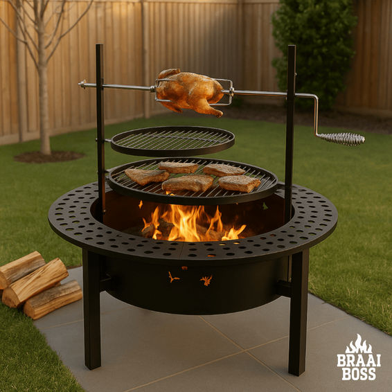 BraaiBoss – 60cm Mega Wood & Charcoal Fire Pit with Warming Grid & Rotisserie Braai