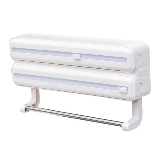 Holds and Stores Kitchen Tissue Paper Roll, Aluminum Foils and Plastic Wrap Films / Cling Film and Dispenses Them in One Single Unit.