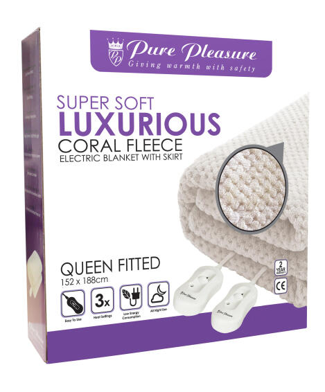 Experience the ultimate in cozy comfort with our Electric Blanket Fitted PURE PLEASURE Queen in elegant white. This luxurious blanket features a soft coral fleece material that will provide you with superior warmth and relaxation throughout the night. The elasticated skirt ensures a perfect fit on mattresses of all depths, while the dual detachable controllers allow for individual control and comfort. Say goodbye to chilly nights and hello to a warm and restful sleep with this electric blanket.
