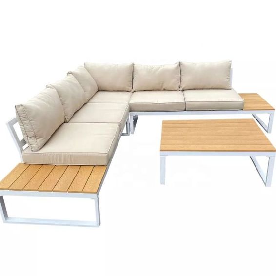 QandAHome Luxury Obsidian L-shaped Beige Outdoor Patio Set with Wooden Table