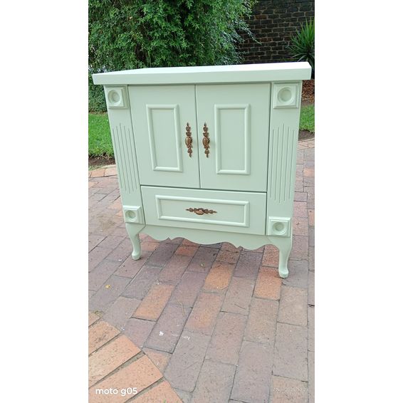 Single Vanity, 800 x 500, Sage green with matching pine top.